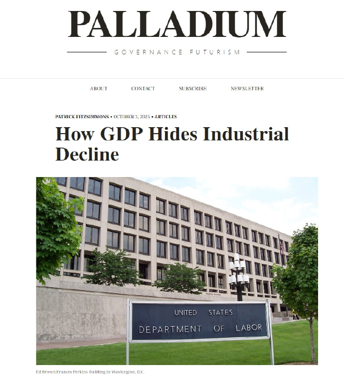 例如Patrick Fitzsimmons在《PALLADIUM》10月3日发表的文章《GDP如何掩盖工业衰退》,就是一个较为深刻的反思。作者开头就提出一个疑问:美国GDP一直升,但做的东西越来越少,认识的大多数聪明人都在做“假工作”。上世纪90年代美国有香港或者越南制造的玩具衣服,但洗衣机、汽车、电脑等高科技商品是美国制造的。然而,现在几乎没啥东西是美国造的了。