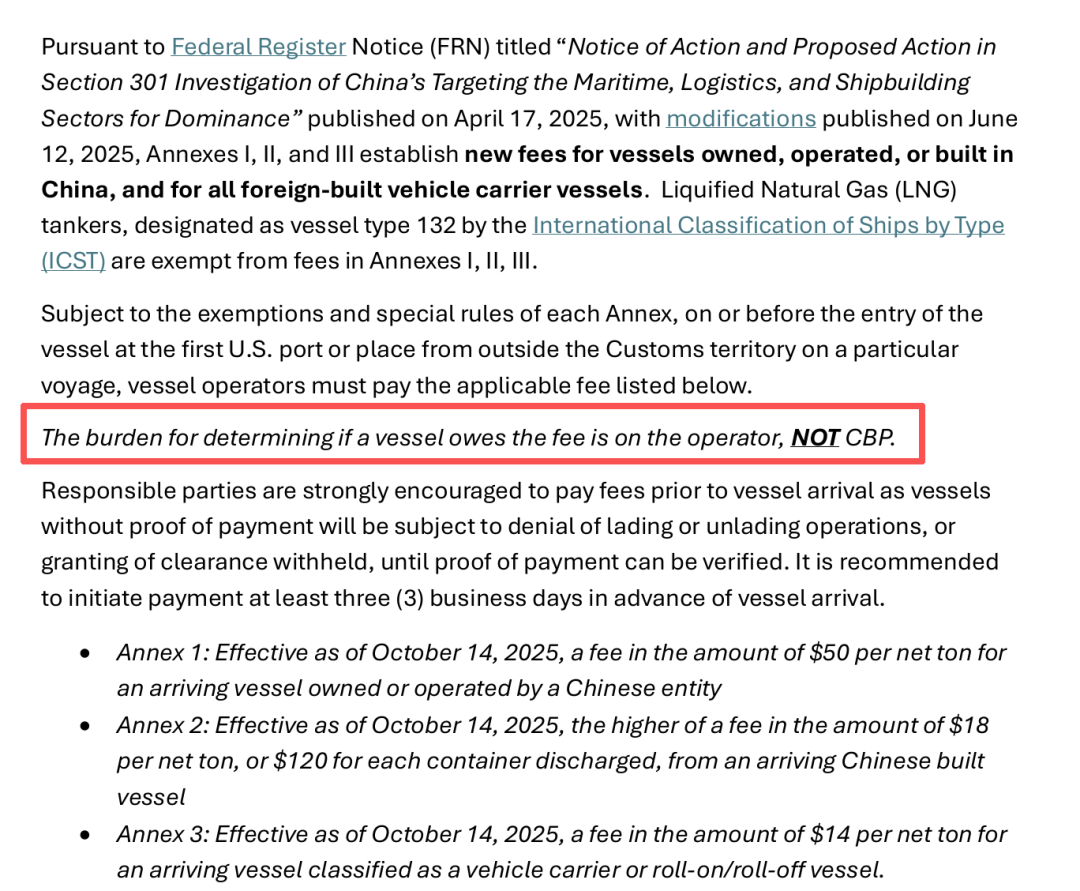 对中国运营、建造的船只歧视性收费、逐年涨价之外,还有一个恶毒的条款:船舶运营方(operator)自行判定是否落入收费范围,并承担缴费义务,美国海关只管收钱不做预审核。美国企图依靠“自我申报”配合“追溯追责”轻松管理,船公司需自行建档备查,CBP保留事后审计与罚款权力。